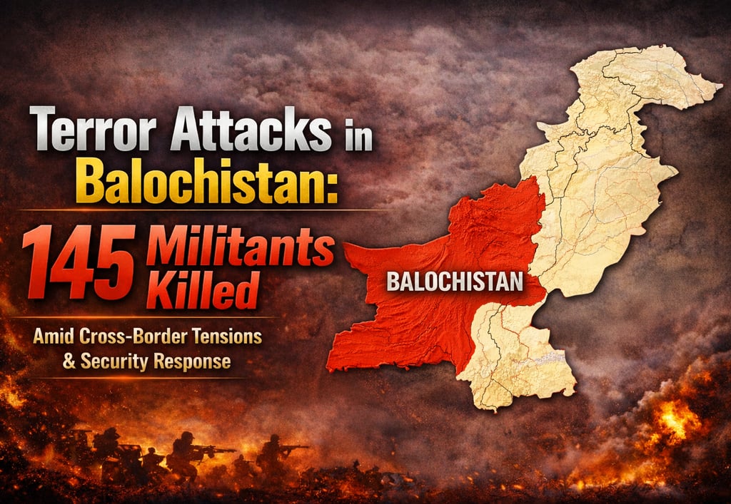 On February 1, 2026, coordinated terrorist attacks in Balochistan killed 145 militants. Pakistan blames external involvement, India denies claims. Full analysis, locations, casualties, and security response.