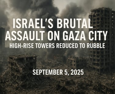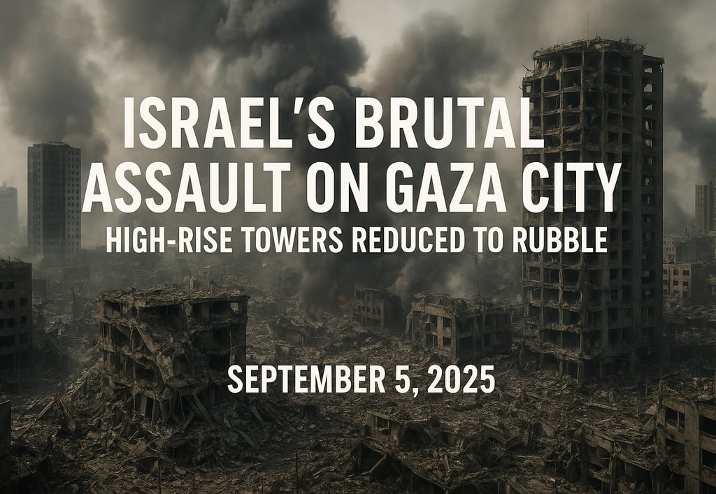 On Sept 5, 2025, Israeli airstrikes leveled Gaza City high-rises, killing 44 including children. Hospitals overwhelmed as humanitarian crisis deepens.